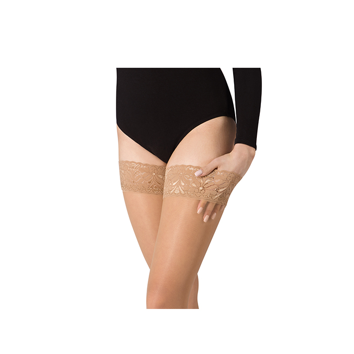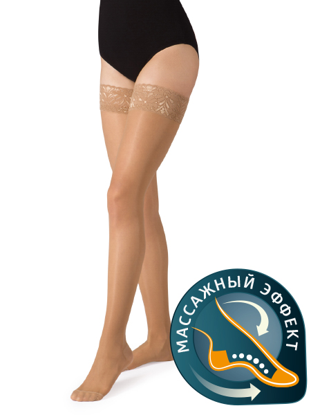 Чулки натурального цвета имеют второй класс компрессии и рекомендованы при терапии заболеваний вен. Особая 3D-вязка обеспечивает прочность изделий даже при регулярной носке. В зоне стопы чулки оказывают массажное воздействие, благодаря чему ноги устают значительно меньше. Носочек телесного цвета, поэтому изделия подходят для открытой обуви. Ажурная резинка с силиконовыми вставками плотно обхватывает ногу и не скользит.