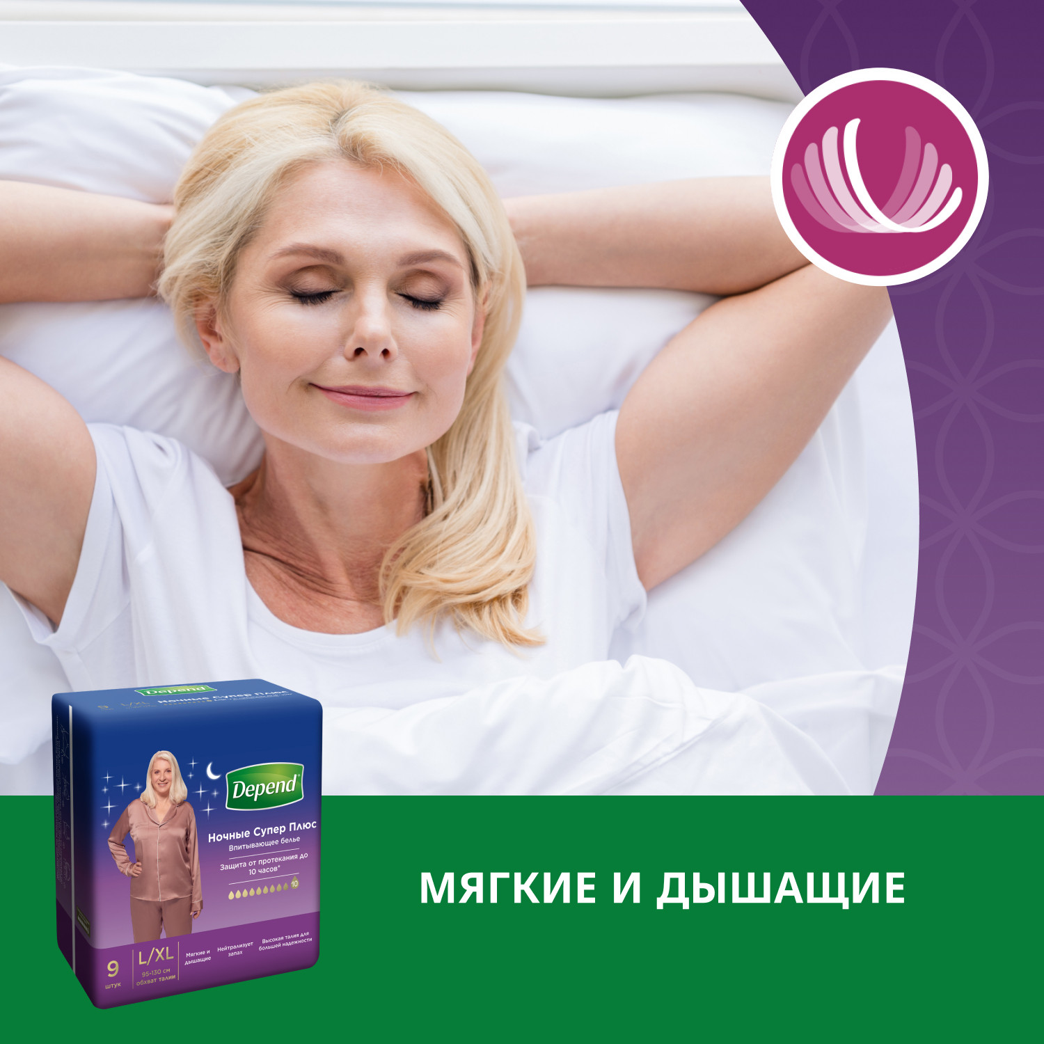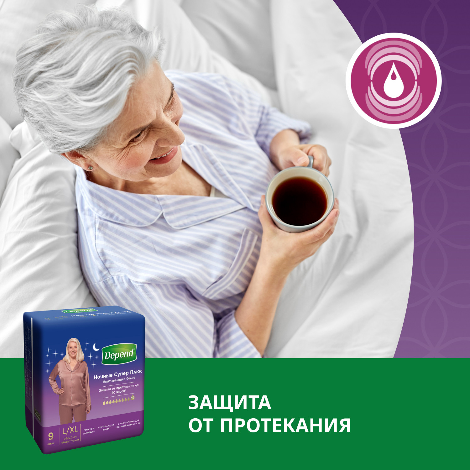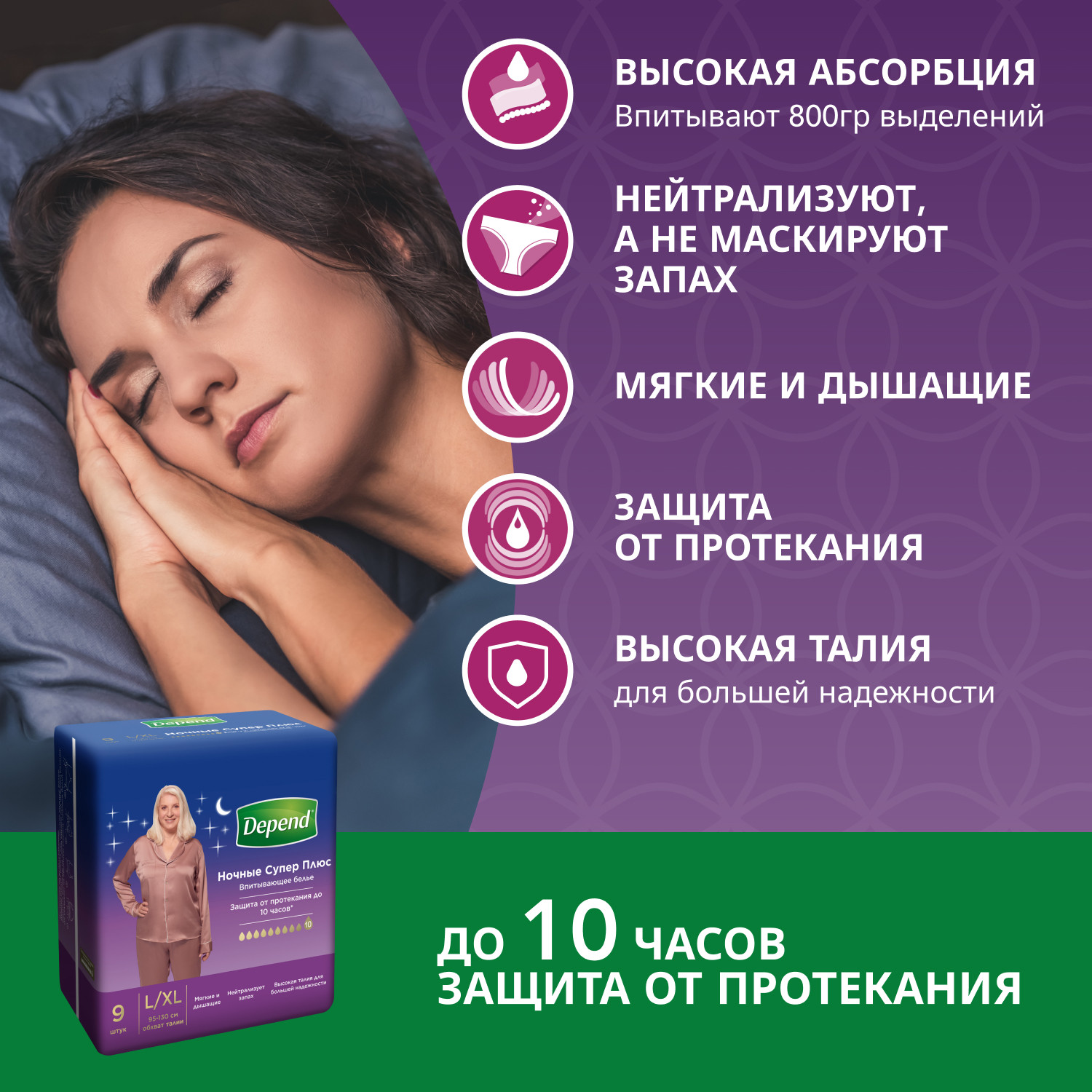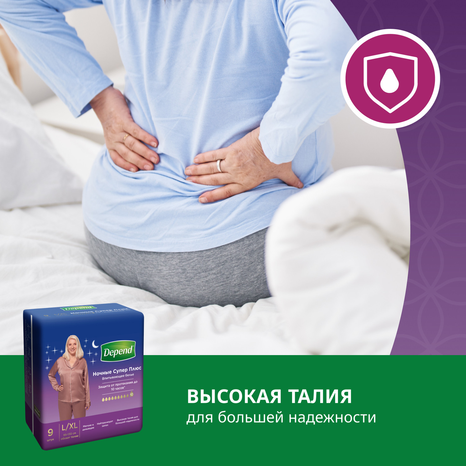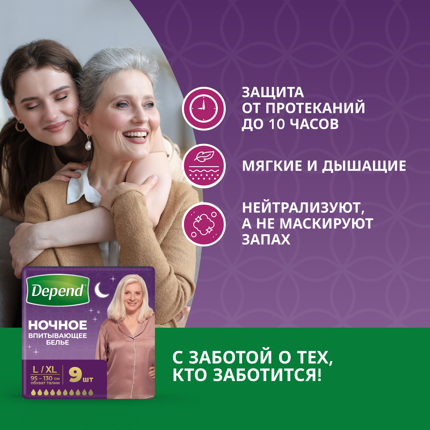 Ночное впитывающее белье Depend L/XL предназначено для женщин с легкой и средней степенью недержания мочи. Эффективно решает деликатную проблему, не лишая возможности вести активный образ жизни. Изделия созданы по современной технологии, комфортны и дарят уверенность в себе.