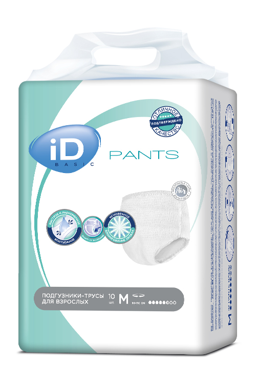 Подгузники-трусы iD Pants Basic от бельгийского производителя Ontex– это лучший вариант для активных людей, которые страдают от средней или тяжелей степени недержания. Размер Medium подходит для людей с объемом талии от 80 до 110 см. Поставляется в упаковках по 10 штук.