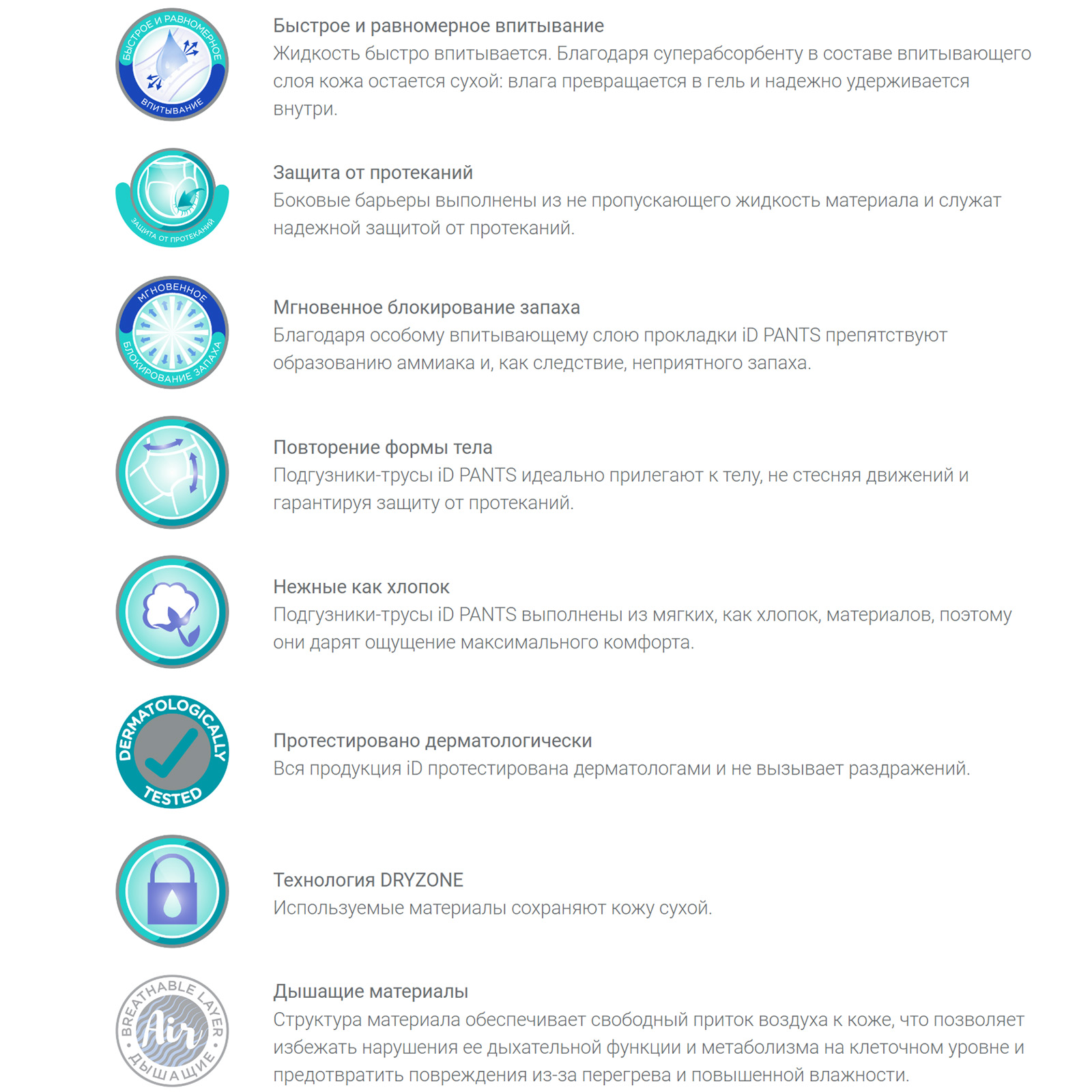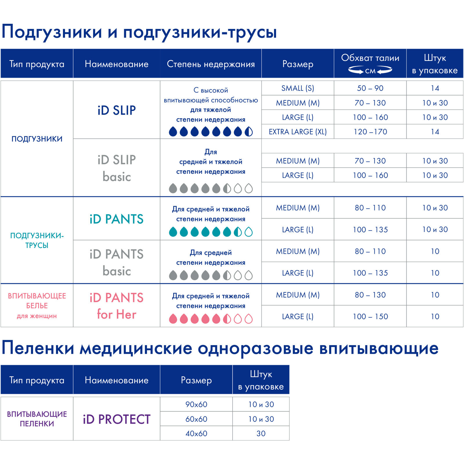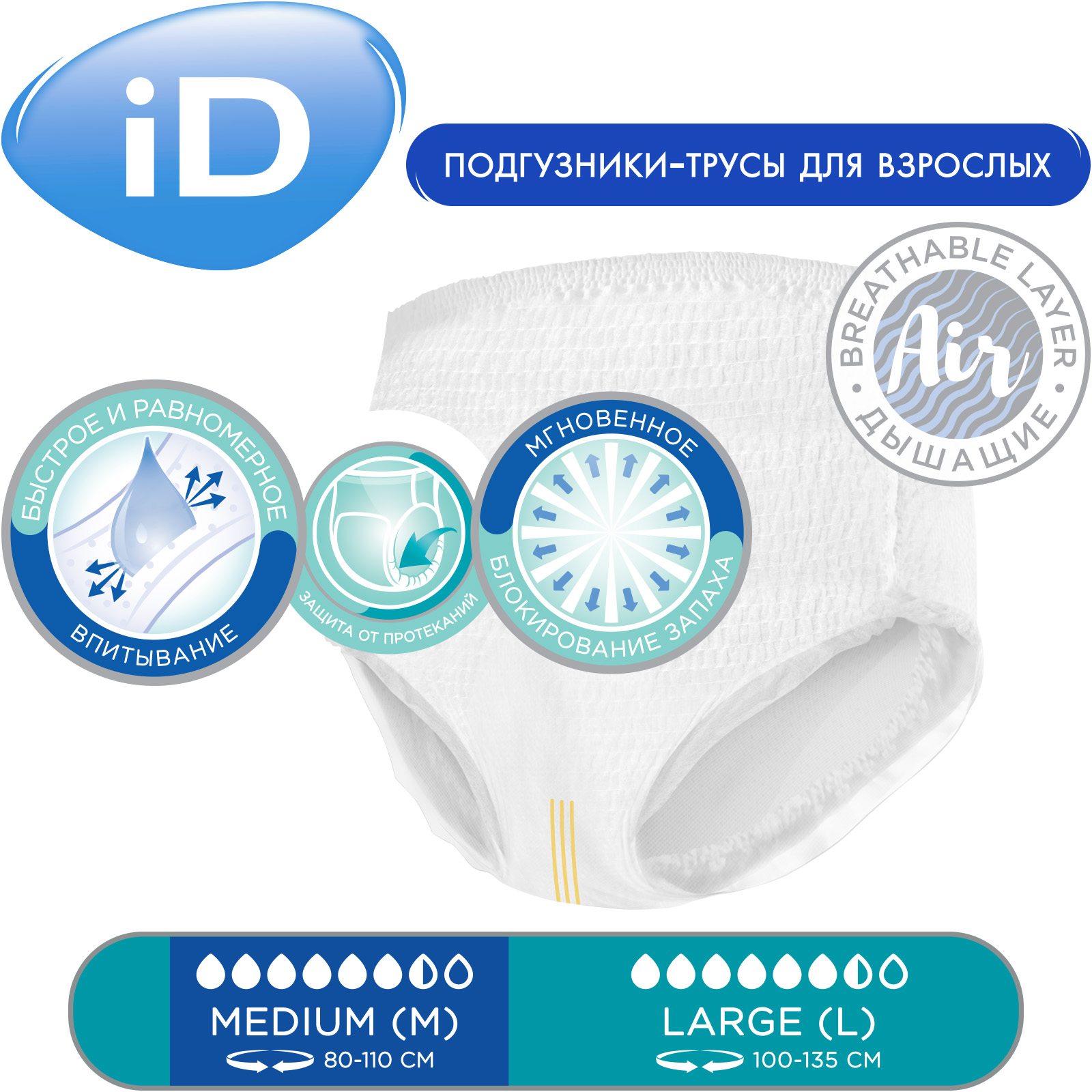 Если больной самостоятельно передвигается и в состоянии надевать нижнее белье, но просто страдает недержанием, подгузники-трусы iD Pants Medium станут выходом из положения. Они замечательно держатся за счет эластичного пояса, качественно впитывают влагу — она сразу превращается в гель. Изделия удерживают неприятный запах, повышая уровень комфорта и самих пациентов, и окружающих. В таких трусах болеющие люди чувствуют себя удобно и уверенно. Подгузники-трусы рассчитаны на объем талии 80-110 см, в упаковке 30 штук.