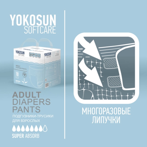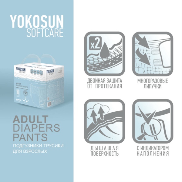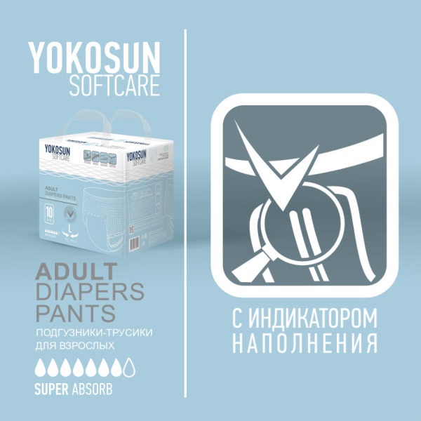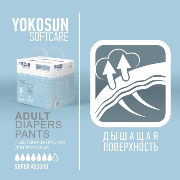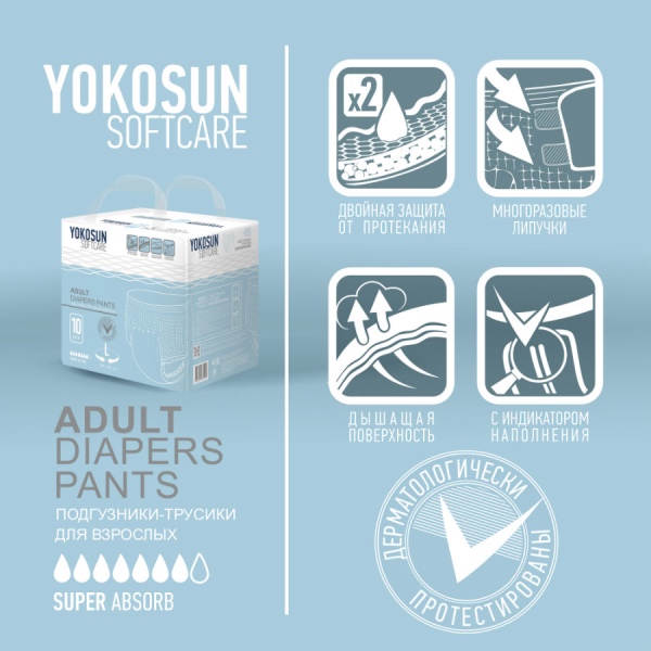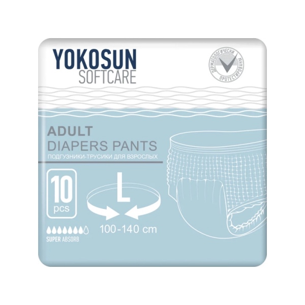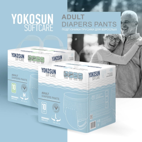 Подгузники-трусы YokoSun обеспечивают сухость и комфорт людям, страдающим средней и тяжелой степенью недержания мочи. Они незаменимы в уходе за лежачими пациентами после травм, операций, инсультов, пожилыми людьми, а также могут использоваться теми, кто ведет активный образ жизни.