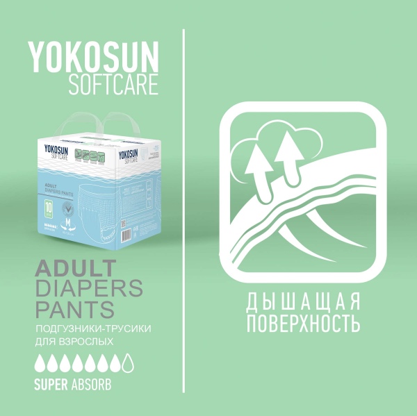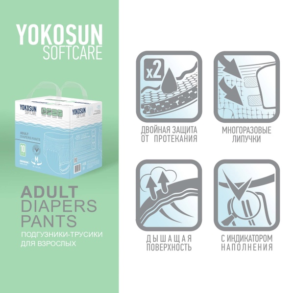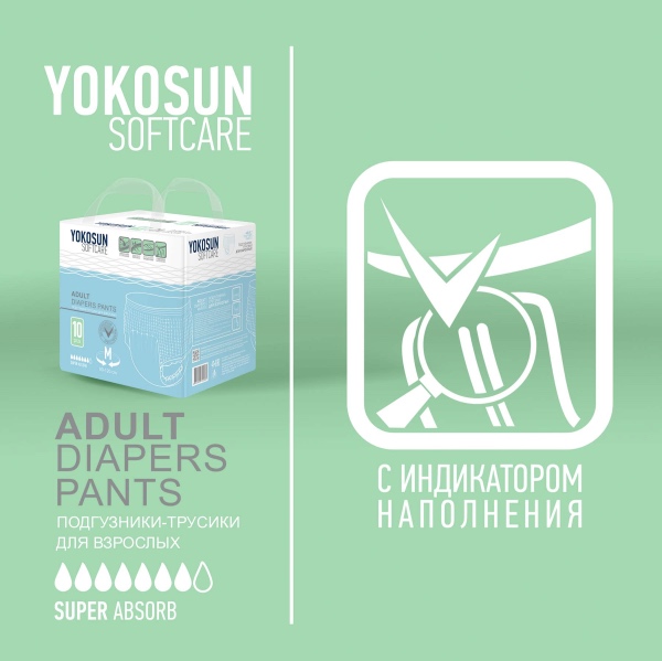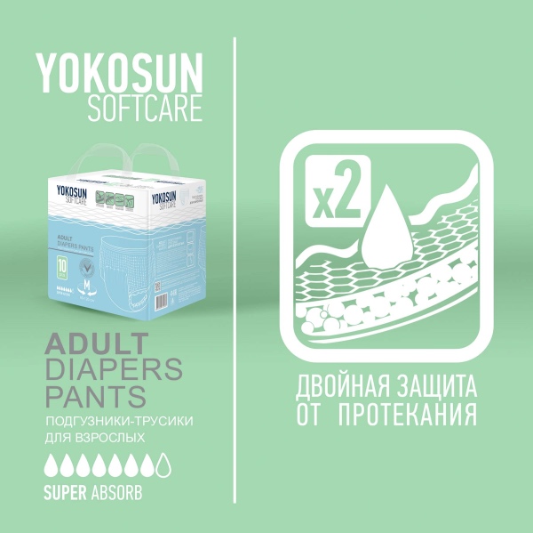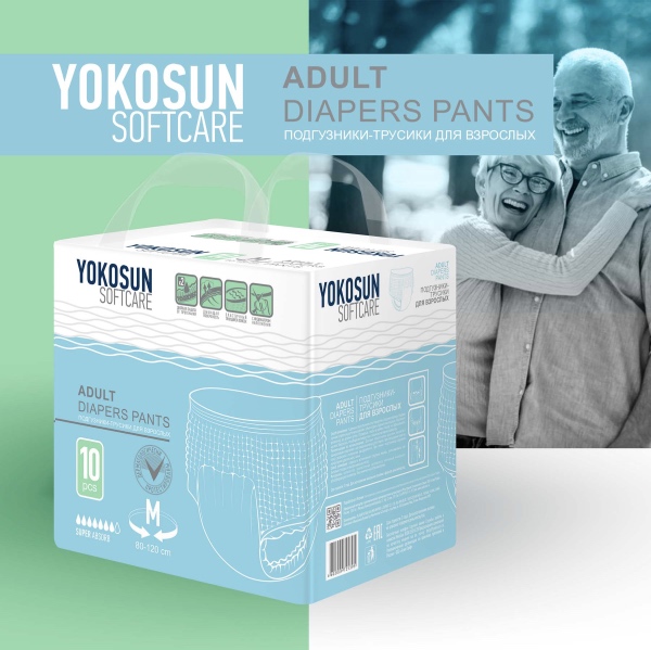Подгузники-трусы YokoSun – незаменимое средство гигиены для взрослых пациентов, страдающих недержанием мочи. Подходят для использования при средней и тяжелой степени недержания, могут применяться людьми, ведущими активную жизнь, и в уходе за лежачими больными.