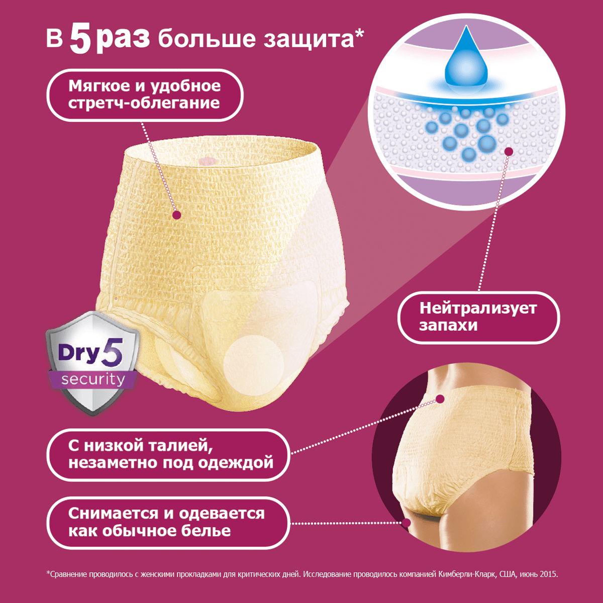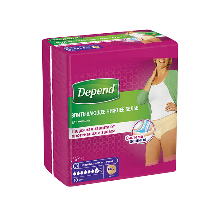 Впитывающее белье Depend M/L предназначено для женщин с легкой и средней степенью недержания мочи. Имеет удобную низкую посадку, плотно облегает, незаметно под одеждой. Эта модель подходит тем, чей обхват талии составляет 70-105 см.