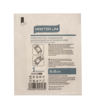 Фиксирующий лейкопластырь MASTER UNI, с подушечкой, для фиксации катетеров, 6 х 8 см, 1шт.