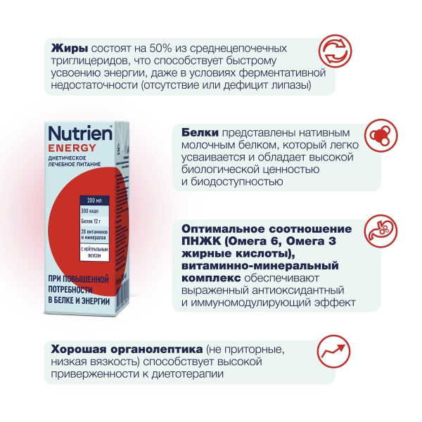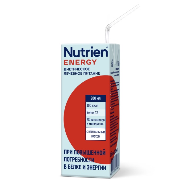 Nutrien®Energy (Нутриэн®Энергия) – жидкая готовая к употреблению смесь, которая предназначена для диетического питания людей с повышенной потребностью в белке. Позволяет скорректировать рацион и устранить недостаточность питания. Поставляется в упаковке тетрапак объемом 200, одноразовая трубочка в комплекте.