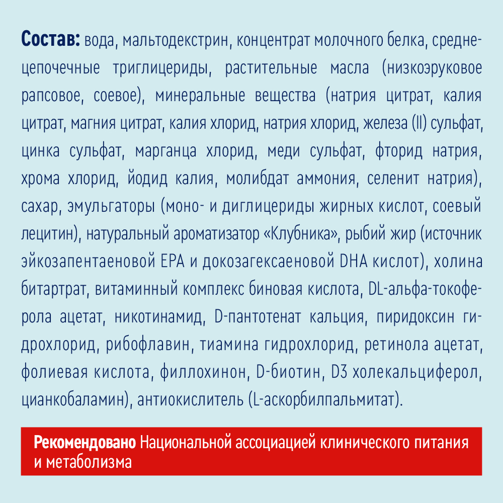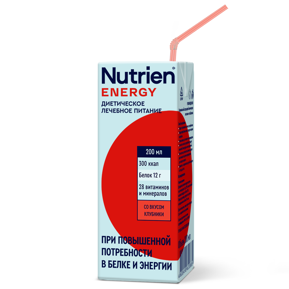 Нутриэн Энергия со вкусом клубники — это продукт, предназначенный для диетического питания детей от 3 лет и взрослых. Готовая пищевая смесь имеет жидкую консистенцию, выпускается в тетрапаке объемом 200 мл. Имеет сбалансированный состав и все необходимые для жизнедеятельности витамины, минералы, микроэлементы. Продукт легкоусвояемый, быстро всасывается и не вызывает аллергической реакции. Может использоваться для зондового питания и при использовании гастростомы. Также подходит для самостоятельного приема пищи.