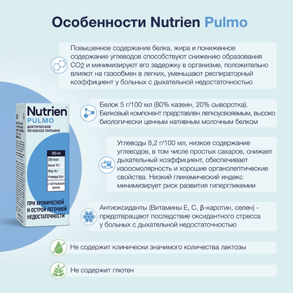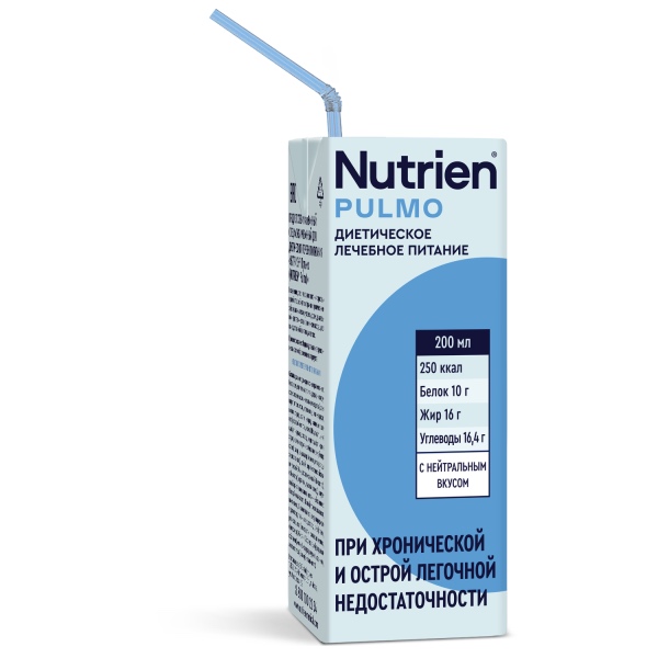 Nutrien® Pulmo (Нутриэн® Пульмо) – продукт для энтерального питания. Применяется во взрослой практике и для детей старше 3 лет, в диетических и лечебных целях: для коррекции рациона питания, профилактики недостаточности питания и ее устранения. Выпускается в виде стерилизованной жидкости нейтрального вкуса, готовой к употреблению.