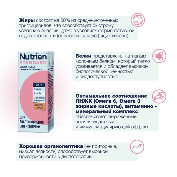 Nutrien®Standard (Нутриэн®Стандарт) со вкусом карамели – это жидкая смесь, которая готова к употреблению. Предназначена для лечебного питания пациентов с недостаточностью питания или высоким риском ее развития. Питание поставляется в упаковках тетрапак объемом 200 мл с одноразовой трубочкой.