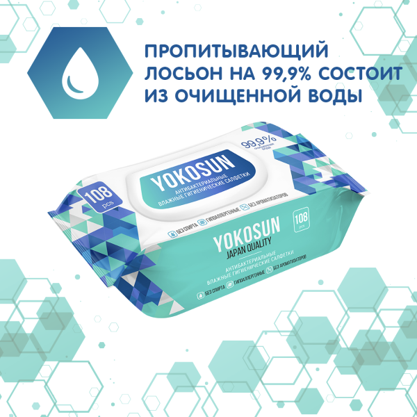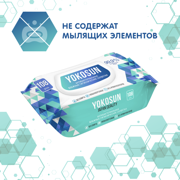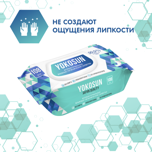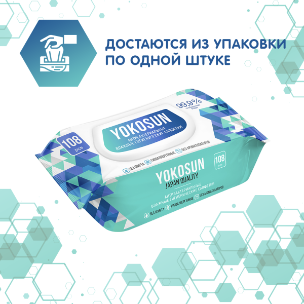 Влажные гигиенические салфетки YokoSun позволяют соблюдать гигиену везде и всегда – на прогулке, в путешествии, дома, когда нет возможности воспользоваться водой и мылом. Салфетки гипоаллергенны и не раздражают даже чувствительную кожу, так как не содержат спирта, ароматизаторов, мылящих веществ. Благодаря этому, а также лосьону-пропитке, на 99,9 % состоящему из очищенной воды, изделие можно использовать в уходе за новорожденными детьми. Тем более они подойдут для применения взрослыми членами семьи. В упаковке 108 салфеток, они удобно извлекаются по одной штуке, не склеиваясь при этом.
