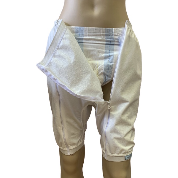 Эти непромокаемые панталоны разработаны для защиты матраса и постельного белья от протекания подгузников. Они изготовлены из дышащей мембранной ткани, которая задерживает жидкость, но при этом пропускает воздух. С внутренней стороны они покрыты мягким махровым материалом, а с внешней - полимерной пленкой. Панталоны легко надевать: достаточно разместить их под пациентом и застегнуть молнии. Мягкий махровый материал впитает влагу, если она все-таки просочилась, предотвратит ее контакт с кожей пациента. Эти панталоны выполнены в виде удлиненных трусов-боксеров и могут использоваться как основное белье в теплую погоду. Подходят для людей, которые носят размер 54-56.