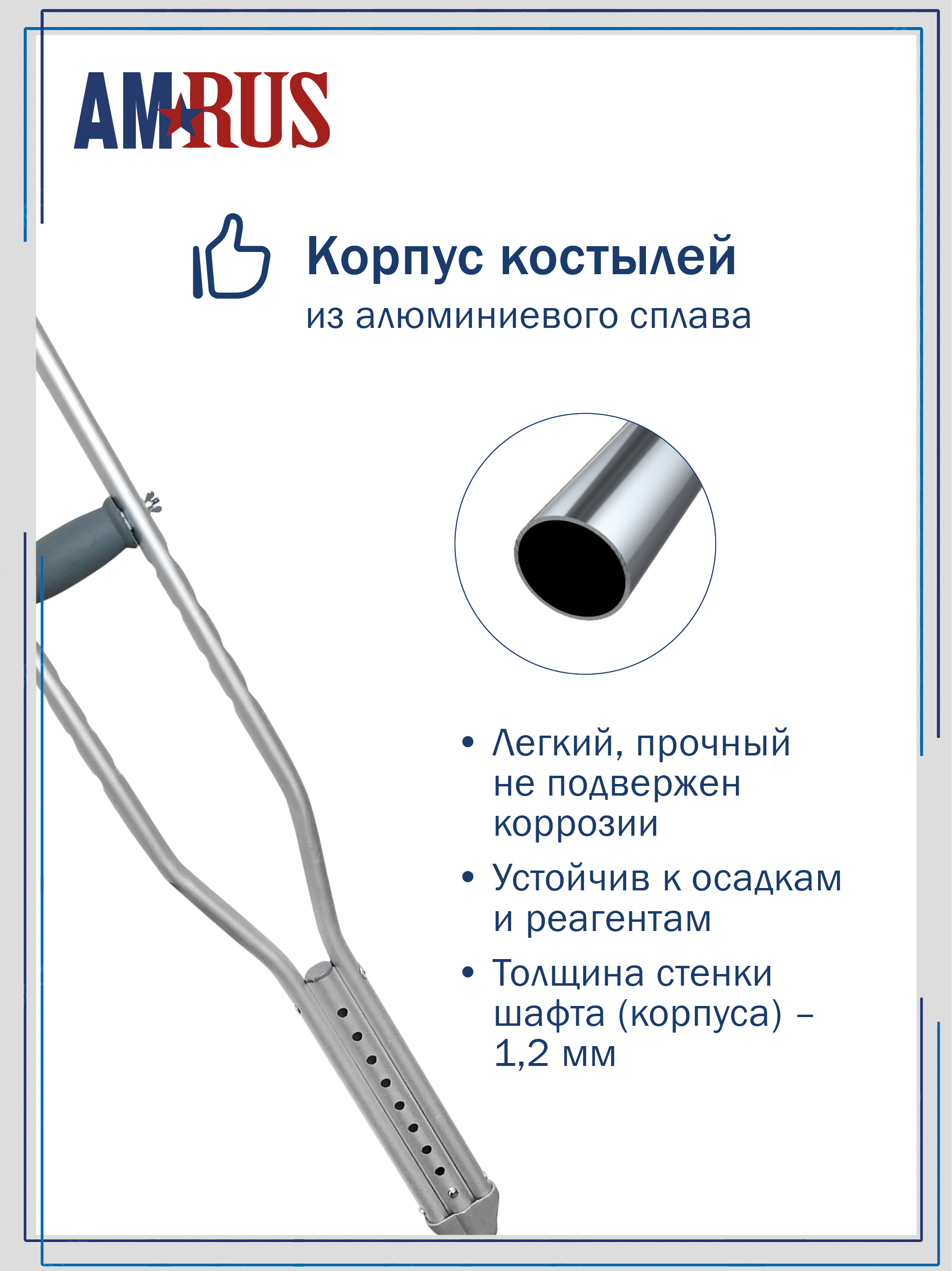 Костыли АMUC 03 предназначены для людей ростом 178-198 см. Цельнолитая конструкция надежна, сплавы алюминия – это легкий, но прочный материал, не подверженный коррозии, выдерживают до 100 кг.