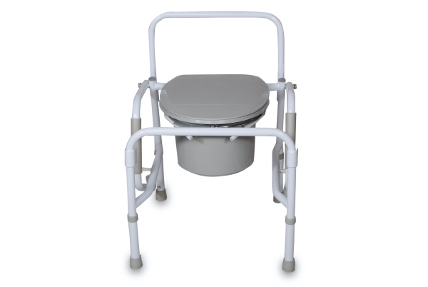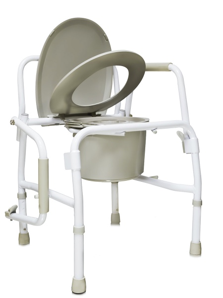 Корпус кресла-туалета АМСВ 6807 выполнен из стали с белым порошковым покрытием, изделие оснащено подлокотниками, откидывающимися вниз. Для удобства у кресла имеется спинка с рамной конструкцией, телескопическая система ножек для регуляции по высоте с шагом 2,5 см.