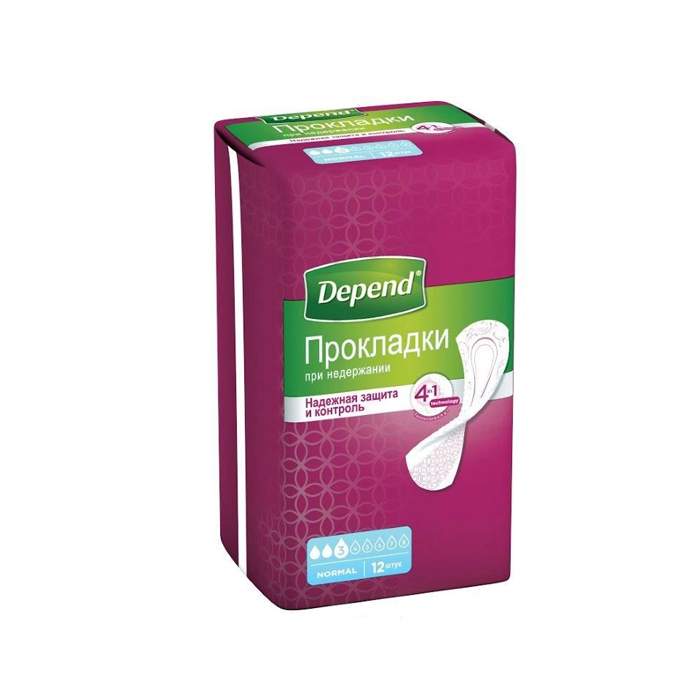 Модель Депенд Нормал имеет уровень впитываемости 3 капли, реализуется в упаковках по 12 штук.