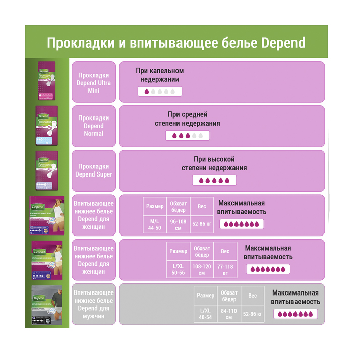 Удобные урологические прокладки Depend Super подойдут при высокой степени недержания мочи. Уникальная система «4 в 1» позволяет обеспечить максимальный комфорт. Жидкость не вытекает — этому препятствуют и хорошо впитывающий слой, и дополнительные надежные бортики. Запах также нейтрализуется максимально быстро, а потому можно не переживать за этот деликатный момент. Прокладки Депенд Супер довольно тонкие, что позволяет надевать их практически под любую одежду.