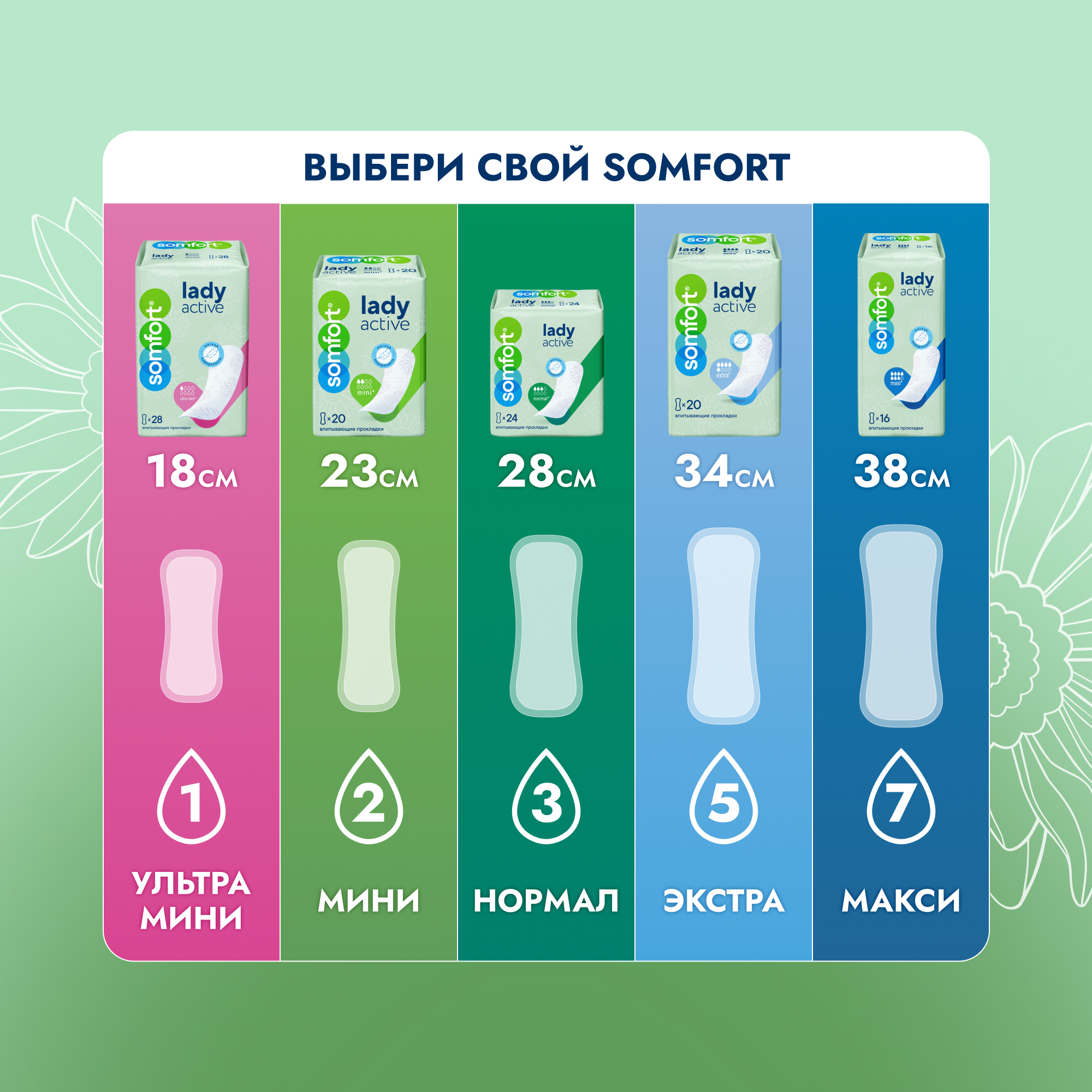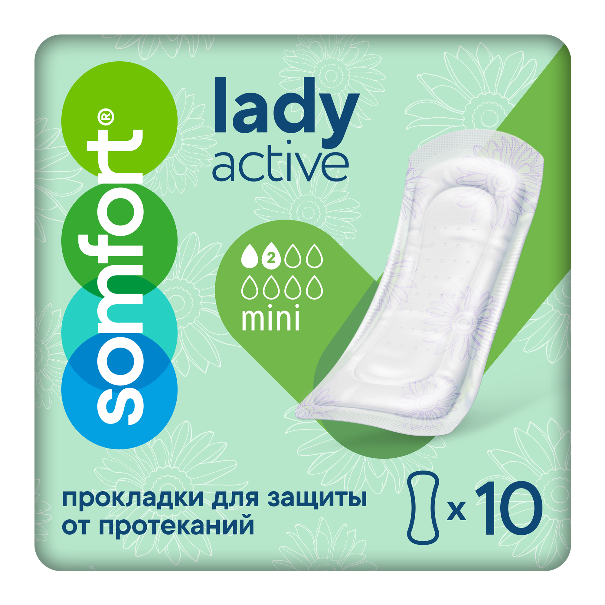 Длина прокладок — 23 см, а уровень впитываемости — две капли. В состав входят целлюлоза, суперабсорбирующий компонент, нетканый материал, полимерная пленка и клей. Для использования достаточно снять защитную полоску и прикрепить прокладку к белью липкой стороной. Somfort Lady Active Mini поставляется в непрозрачной упаковке, что обеспечивает дополнительную конфиденциальность при покупке.