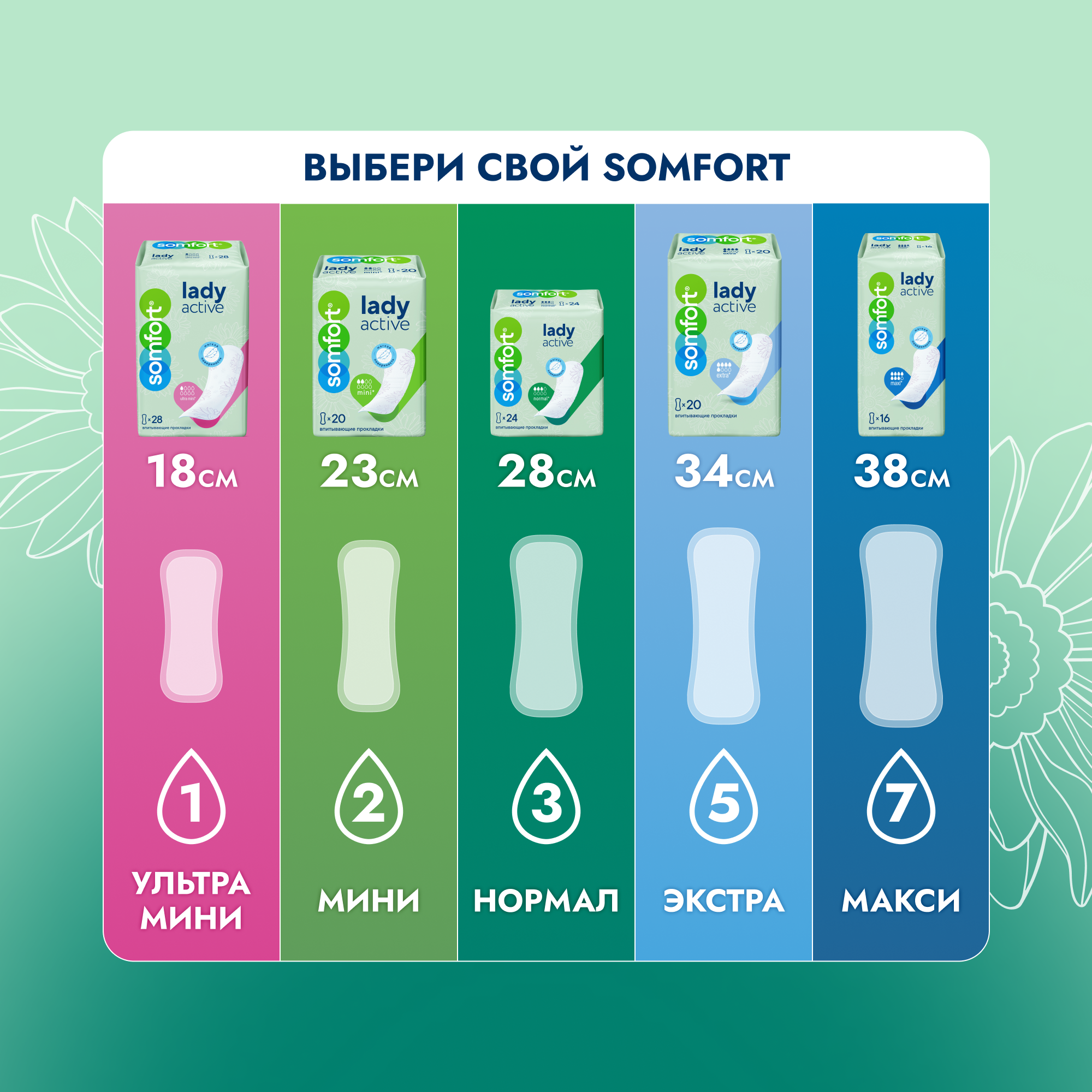 Каждая прокладка упакована в индивидуальную упаковку. Somfort Lady Active Normal поставляется в дополнительной непрозрачной упаковке, что гарантирует конфиденциальность при транспортировке и покупке.