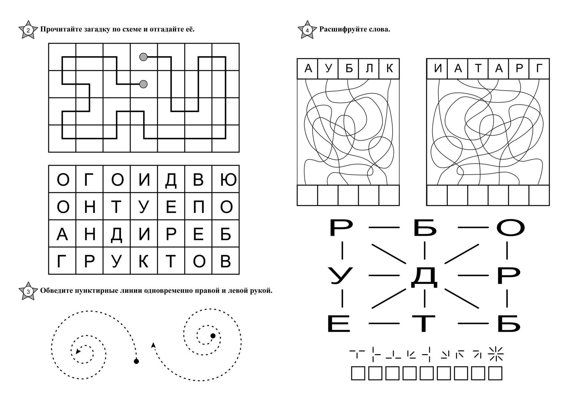 Внутри — разнообразные задания разного уровня сложности: логические, графические, письменные, на пространственное мышление и зрительно-моторную координацию. Все упражнения адаптированы под ежедневные короткие занятия — от 15 до 20 минут в день.